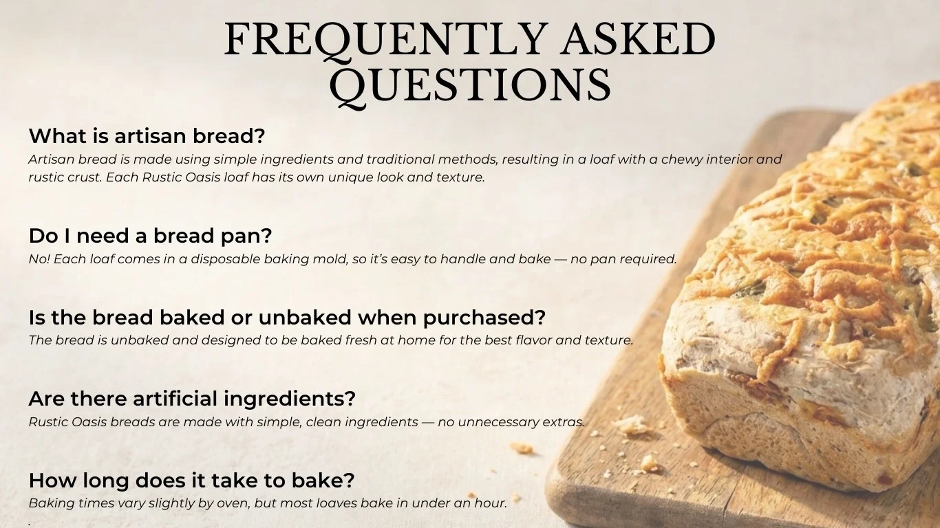 Have a question about Rustic Oasis Artisan Bread, flavors, or how it works? We’d love to hear from you. Fill out the form below and someone from our team will be in touch soon.